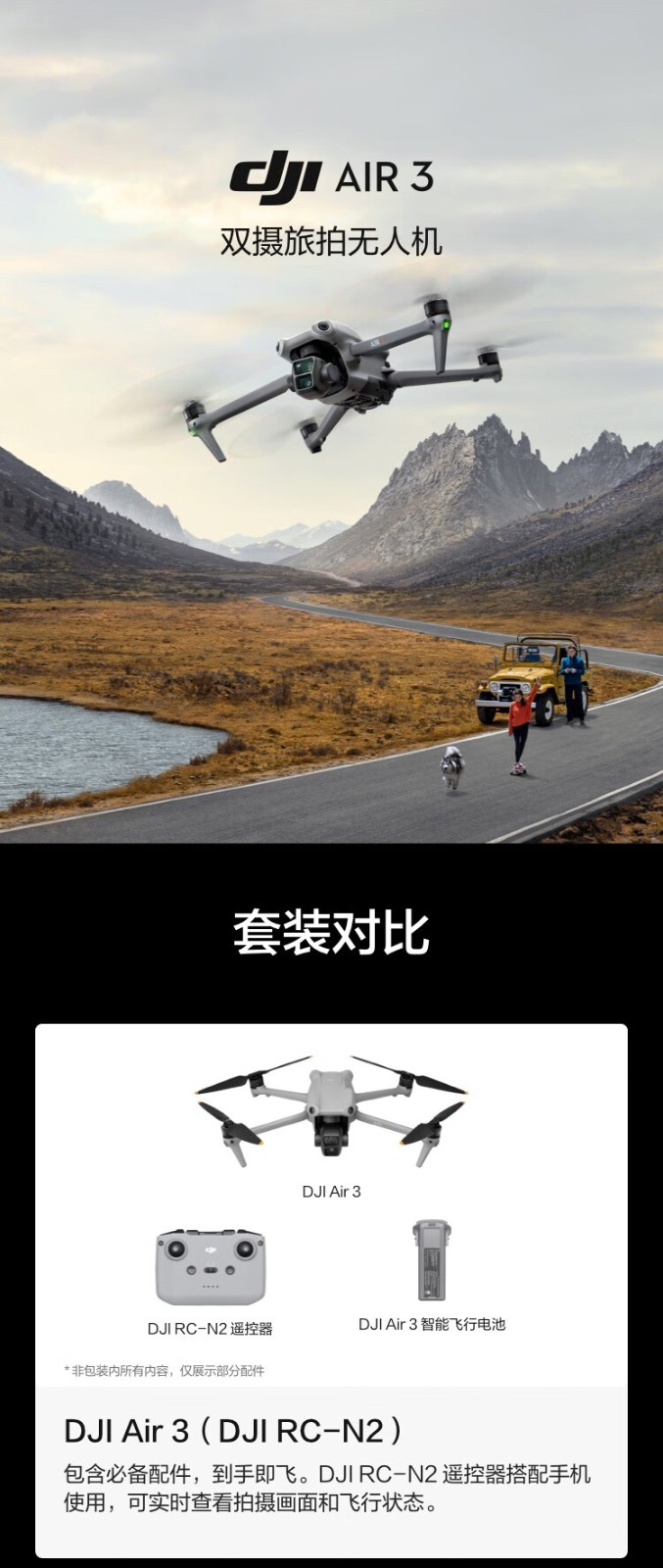 【新品预订】大疆(DJI)Air 3 广角双摄旅拍 高清专业航拍无人机 畅飞套装(RC-N2)【无货退款】